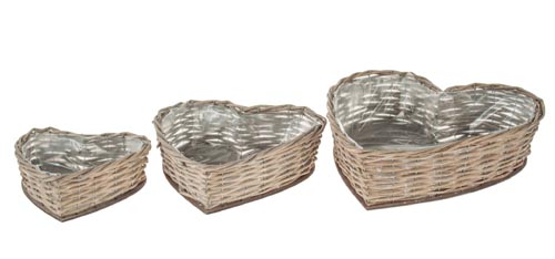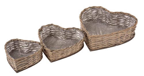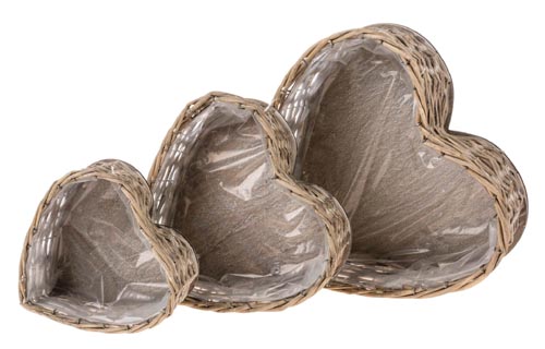 Coș nuiele - inimă, gri - alb calcaros, căptușit cu folie, 3 buc, ø 19 x 7 cm, ø 25 x 8 cm, ø 32 x 1